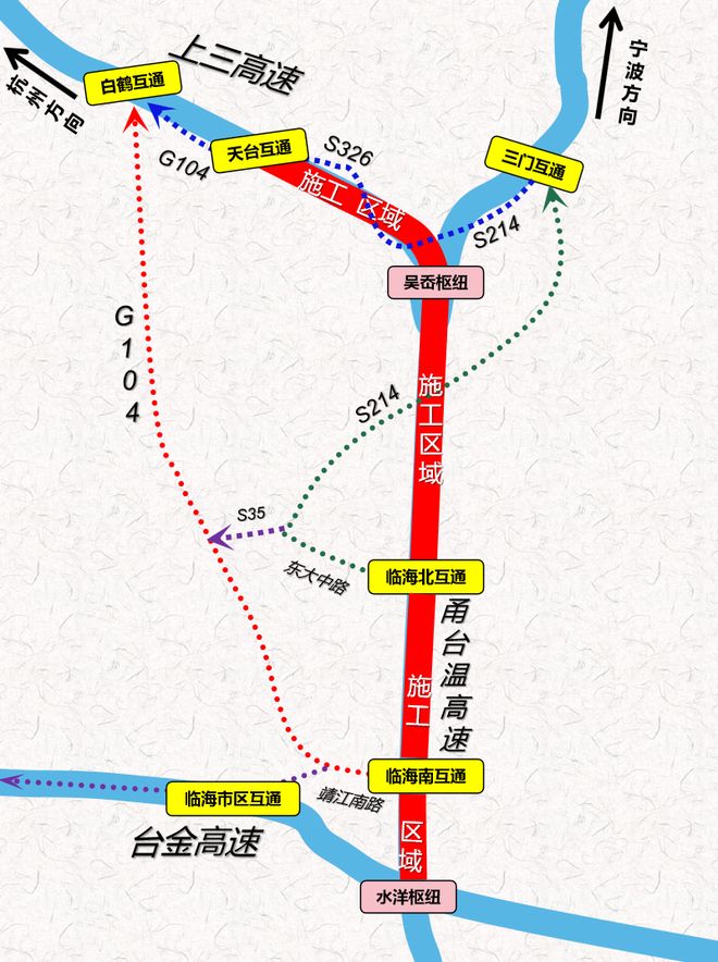 因G15沈海(hǎi)高(gāo)速臨海(hǎ₹∏×i)段 G1522常台高(gāo)速天台段 路(lù)面養護施工(gōσ×ng)需要(yào) 施工(gōng)部門(mén)計(jì)劃4月(yuè)8日(rì)至9日(rì)(連續2天)每日(rì)5時(shí)至19時(shí)在G15沈海(hǎi)高(gāo)速甯波方向水(shuǐ)洋樞紐至吳岙樞紐G1522常台高(gāo)速杭州方向吳岙樞紐至天台互通(tōng)路(lù)段實施單向斷流施工(gōng)的(de) 交通(tōn©♠g)管制(zhì)措施