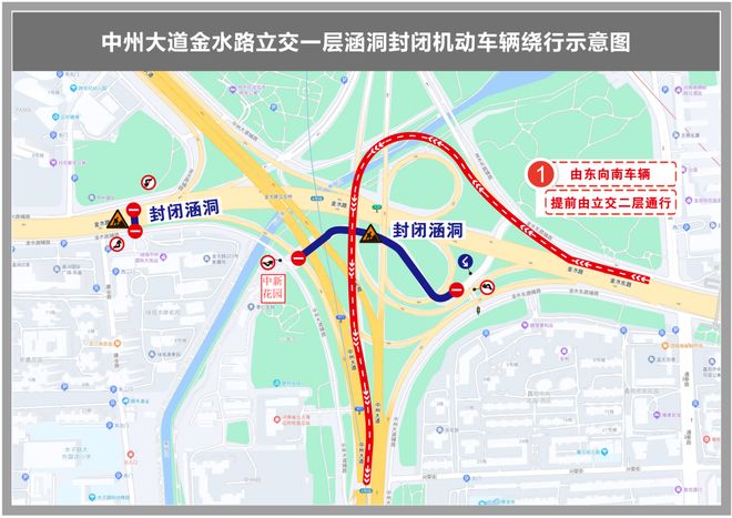 封閉範圍:中州大(dà)道(dào)金(jīn)水(shuǐ)路(l♥ ↕ù)立交建業(yè)路(lù)口東(dōng)1≤✘0米立交橋涵洞封閉;金(jīn)水(shu≠εǐ)路(lù)由西(xī)向東(dōng)方向一(y♦•∞λī)層輔道(dào)通(tōng)往鄭東(←♥α'dōng)新區(qū)以及CBD方向立交橋涵洞封閉。