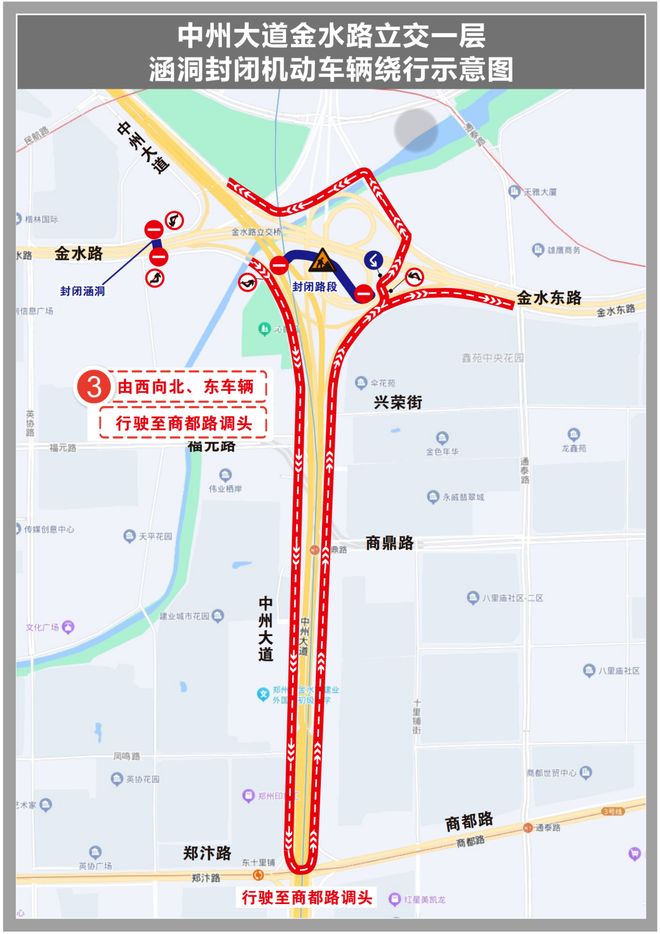 三是(shì)金(jīn)水(shuǐ)路('βlù)由西(xī)向東(dōng)方向一(y≥γī)層輔道(dào)從(cóng)建業(yè)路(lù)口©☆'東(dōng)10m涵洞掉頭向金(jīn)水(shuǐ→)西(xī)路(lù)機(jī)動車(chē)輛(liànΩ↕g)禁止通(tōng)行(xíng),過往車(↑©§chē)輛(liàng)可(kě)由中州大(dà)道(dào)一(y↑≠→÷ī)層輔道(dào)向南(nán)行(xíng)駛至商都(dōu)路αΩ↑(lù)掉頭,然後向北(běi)由金(jīn)水(shuǐ) ₽→立交二層駛入金(jīn)水(shuǐ)西(xī)路(lù)。