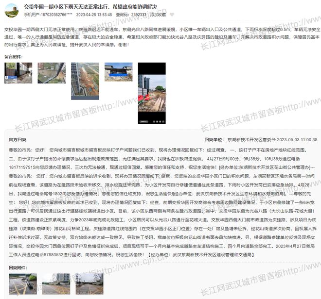 交投華園一(yī)期西(xī)側大(dàφ£←)門(mén)無法正常使用(yòng),慶珪路©γ←(lù)遲遲不(bù)能(néng)通(tōng)車(ch✔'γβē),東(dōng)側光(guāng)谷八路(lù)同樣進"®&$展緩慢(màn),小(xiǎo)區(qū)唯一(σε'yī)車(chē)輛(liàng)出入口及公共通(tōng)道(dào)&≤"Ω,下(xià)雨(yǔ)積水(shuǐ)深度超<≥過0.5m,車(chē)輛(liàng)無法安全通(tōng)過,唯£φ×一(yī)的(de)人(rén)行(xíng)通(tōng)道(dào)是(₹σ∞shì)消防應急通(tōng)道(dào),存在極大(dà)♥±★→的(de)安全隐患,希望相(xiàng) ≈∞σ關政府部門(mén)能(néng)加快(k₹γ'₩uài)光(guāng)谷八路(lù)及慶珪路(lù)的(de)建設及通(λβ γtōng)車(chē),并解決市(shì)政道(dà∞₩$o)路(lù)積水(shuǐ)問(wèn)題,保障居民(mín)基本的(de)≈≥€γ出行(xíng)需求,真正為(wèi)人¶ (rén)民(mín)謀福祉、提升武漢人(réε<•n)民(mín)的(de)幸福感。謝(xiè)謝(xiè)!"'