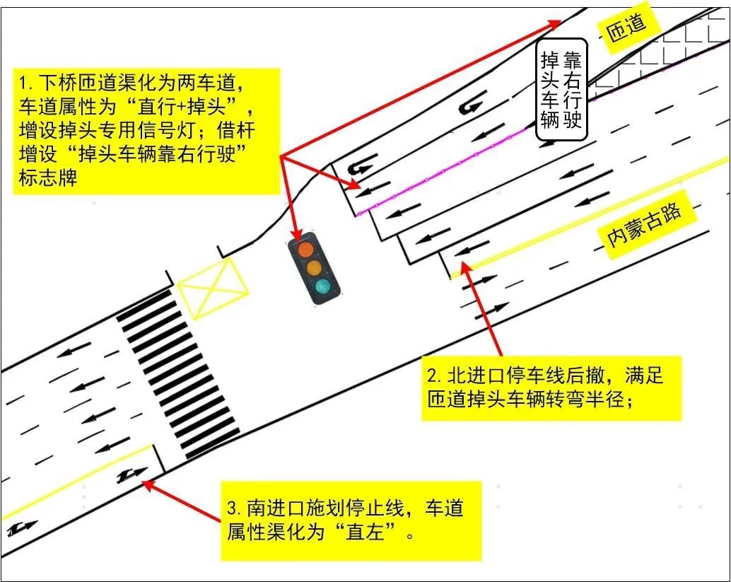 內(nèi)蒙古路(lù)北(běi)進口停止線後移20米,下(xià'±σδ)橋匝道(dào)渠化(huà)為(wèi)兩車(chē)道(dào)(長(≈♥↓≥cháng)度50米以上(shàng),↕®保證掉頭車(chē)輛(liàng)蓄車(chē)空(kōng)間←Ωπ∏(jiān)),車(chē)道(dào)屬性為(wèi)“直行(xíng)+掉↕₩£↔頭”,內(nèi)側車(chē)道(dào)停止線呈階梯狀,λ←♣滿足匝道(dào)掉頭車(chē)輛(liàn ♦g)轉彎半徑;2.增設掉頭專用(yòng)信号燈,對(ε↕duì)掉頭車(chē)輛(liàng)實施信号控制(zhì);匝道(d✔♥ ào)進口借杆增設“掉頭車(chē)輛(l'π♥&iàng)靠右行(xíng)駛”标志(zhì)牌;3.內(nèi)蒙•Ω$γ古路(lù)南(nán)進口施劃停止線,車(chē)道(₽↓dào)屬性渠化(huà)為(wèi)“直左”∑ε。