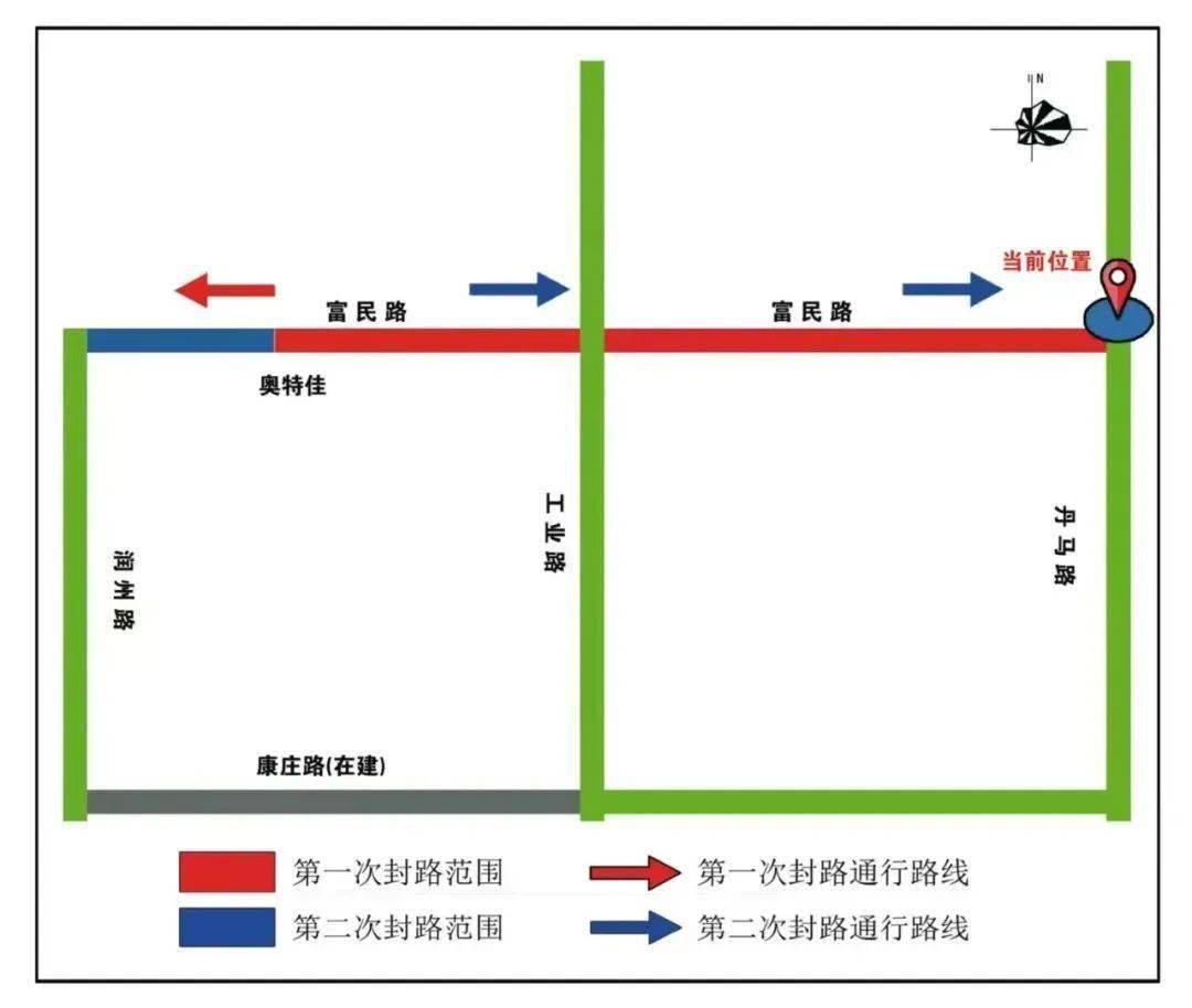 封閉時(shí)間(jiān):本次富民(mín)路(lù)分(fēn)兩階段實施封閉。