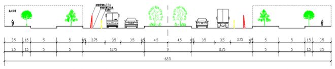 兩側各占用(yòng)1個(gè)車(chē)道(dà₹ o),用(yòng)H800護欄分(fēn)隔出人(rén)行(xíng)道(φ∏dào)及非機(jī)動車(chē)道(dào)。保$←留雙向4車(chē)道(dào),車(chē)道(dào)寬3.5m。