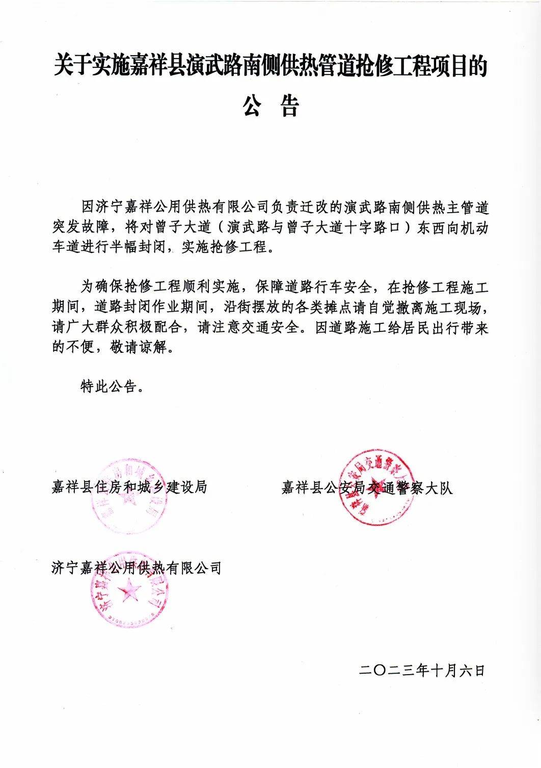 關于實施嘉祥縣演武路(lù)南(nán)側供熱(rè)管道(dào)搶修工(gδ'ōng)程項目的(de)公告