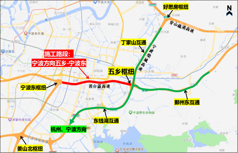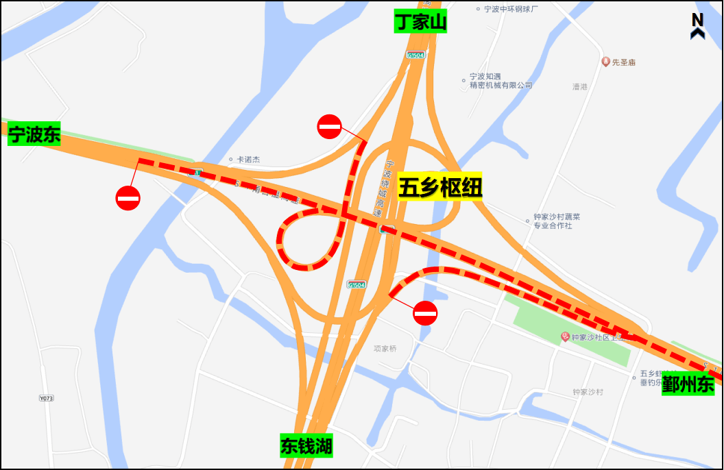 往北(běi)侖方向的(de)車(chē)輛(liàng)可(kě) λ∑自(zì)五鄉(xiāng)樞紐轉G1504甯波繞城(chéng)高(gā"↔&o)速、S20穿山(shān)疏港高(gāo)速。