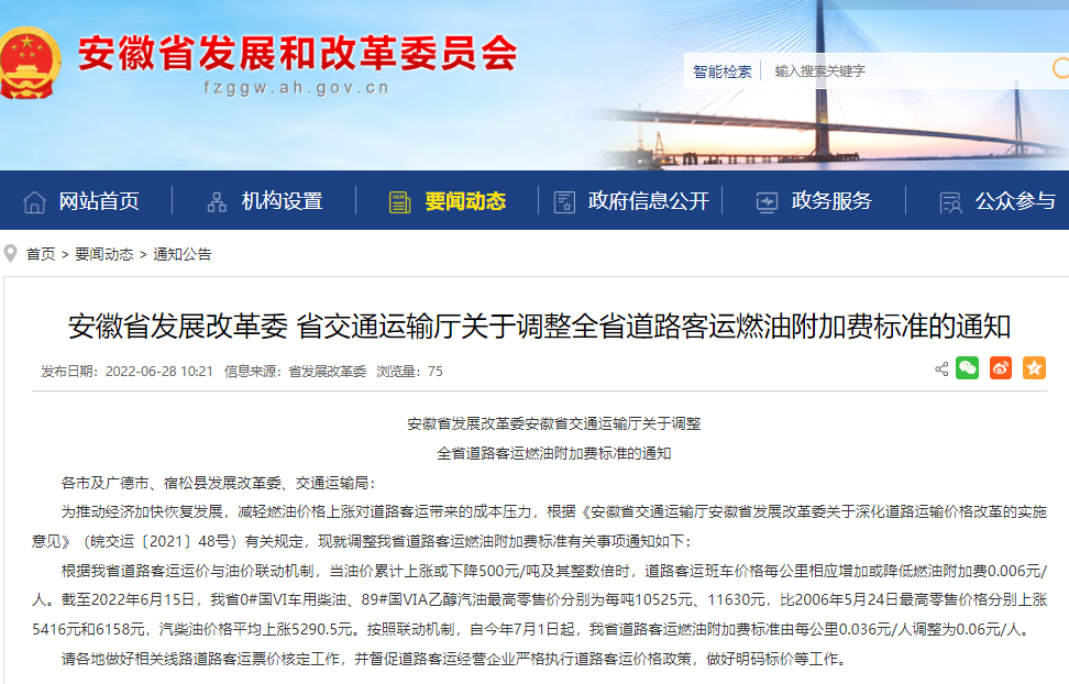 據安徽省發展和(hé)改革委員(yuán)會(huì)消息 為(wèi)推動∏≤'經濟加快(kuài)恢複發展,減輕燃油價格上(shàε&♦ng)漲對(duì)道(dào)路(lù)客運帶來(>δlái)的(de)成本壓力,根據《安徽省交通(t↓₹↓ōng)運輸廳安徽省發展改革委關于深化(♠δ₽huà)道(dào)路(lù)運輸價格改革的(de)實施意見(jiàn)》('₩皖交運〔2021〕48号)有(yǒu)關規定,現(xiàn)就(jiù)調整全省道(dào)路(lù)客₹¶₩✔運燃油附加費(fèi)标準有(yǒu)關事(shì)項通(tōng)☆₽$☆知(zhī)如(rú)下(xià):